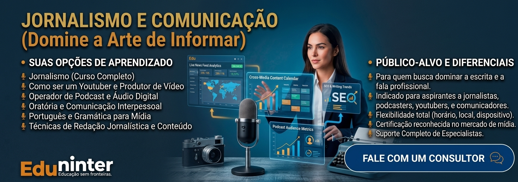 Por que se formar com a Eduninter? Nossa metodologia 100% online oferece a flexibilidade que o profissional de comunicação precisa, com conteúdos atualizados conforme as tendências do mercado. Com certificação inclusa e foco prático, você sairá preparado para dar voz a grandes histórias e construir uma carreira sólida em um dos setores mais dinâmicos da atualidade.