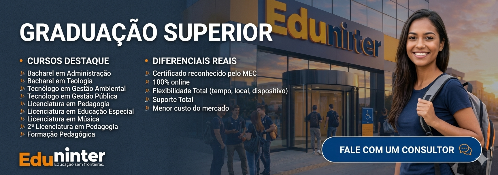 Na Eduninter EAD, você conta com uma plataforma moderna, conteúdos atualizados e suporte dedicado, garantindo uma jornada acadêmica completa, acessível e transformadora.