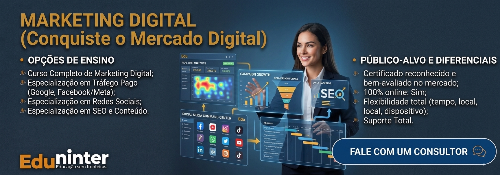 Por que se especializar com a Eduninter? Nossos cursos são 100% online, permitindo que você estude no seu ritmo, de qualquer dispositivo. Com foco total na prática do mercado e certificação inclusa, você terá em mãos o conhecimento necessário para dominar os algoritmos e ditar as regras do seu sucesso digital.